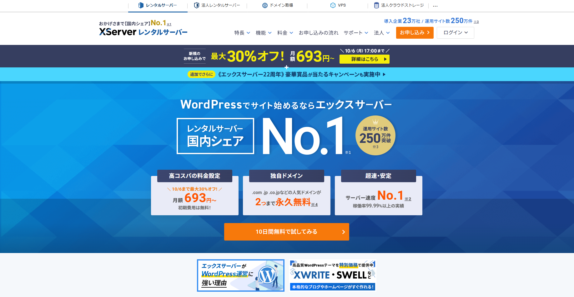 10日間は無料でサービスのお試しが出来るため、少しでも気になった方は、エックスサーバーの公式サイトを確認してみてください!